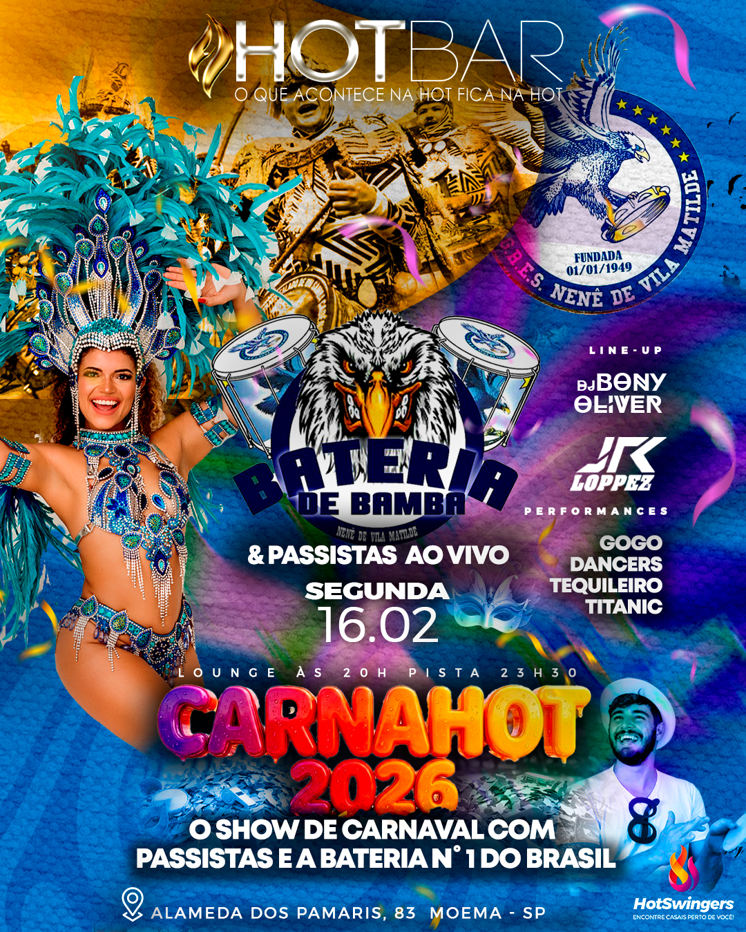 Segunda-Feira dia 16 de Fevereiro de 2026, acontece em Moema a festa Carna Hot, promovida pela Hot Bar São Paulo, a melhor casa de swing e balada liberal de São Paulo. A festa inicia as 20:00 com a abertura do lounge onde os casais de encontram para um bate-papo, a paquera pega fogo com a abertura da pista as 22:30.