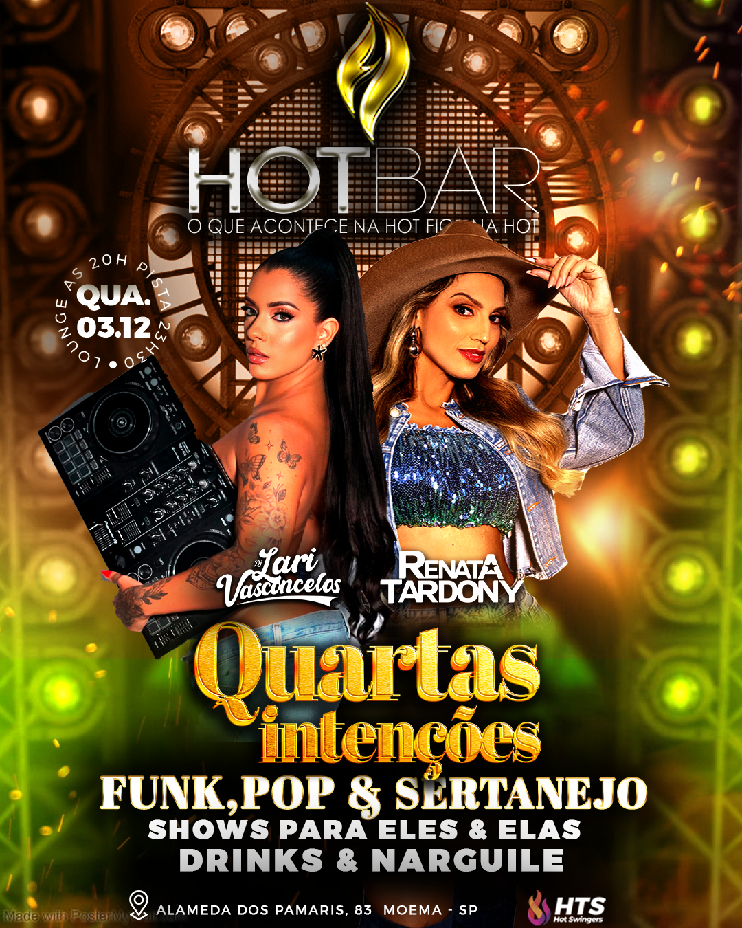Quarta-Feira dia 03 de Dezembro de 2025, acontece em Moema a festa Quartas Intenções , promovida pela Hot Bar São Paulo, a melhor casa de swing e balada liberal de São Paulo. A festa inicia as 20:00 com a abertura do lounge onde os casais de encontram para um bate-papo, a paquera pega fogo com a abertura da pista as 22:30.